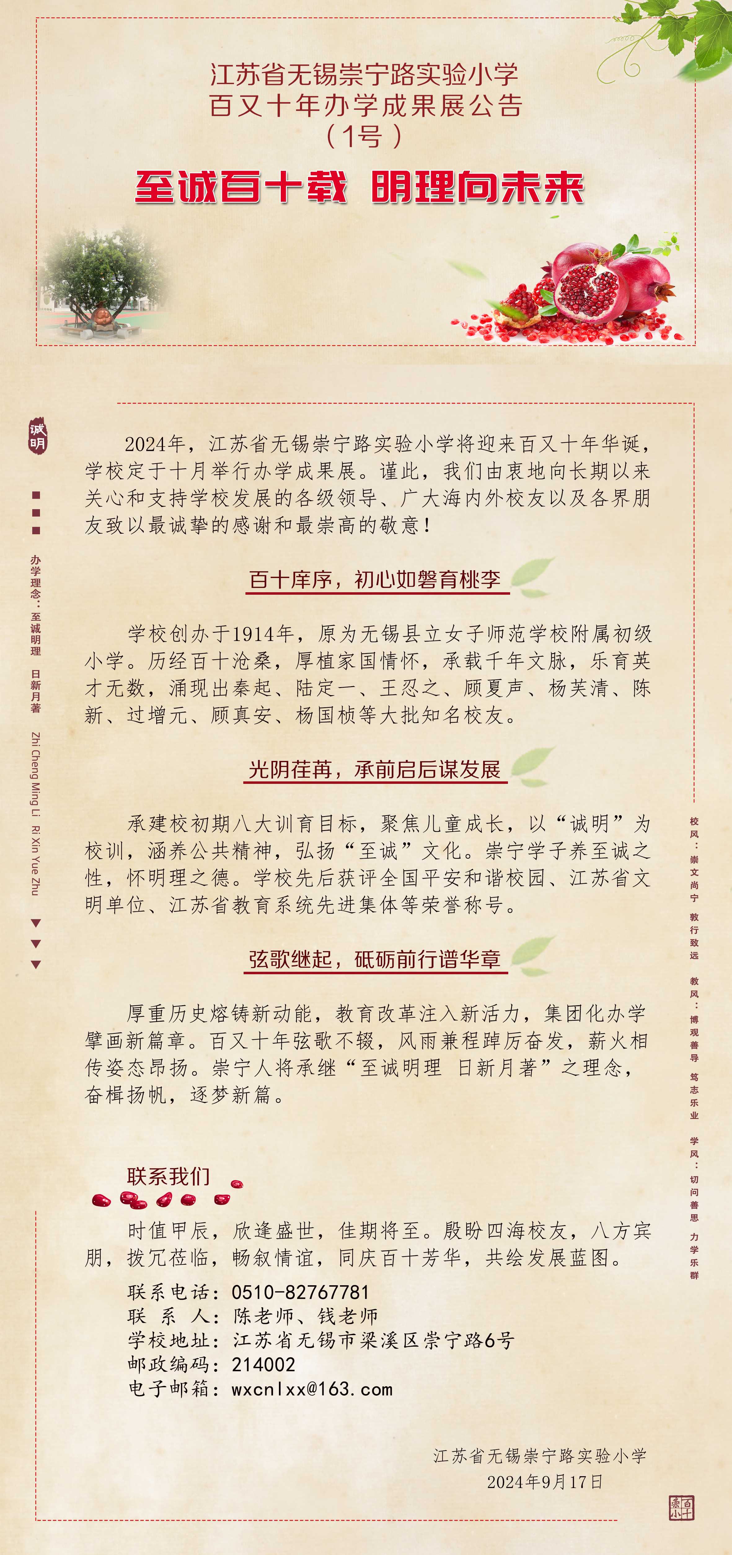 江苏省无锡崇宁路实验小学百又十年办学成果展公告